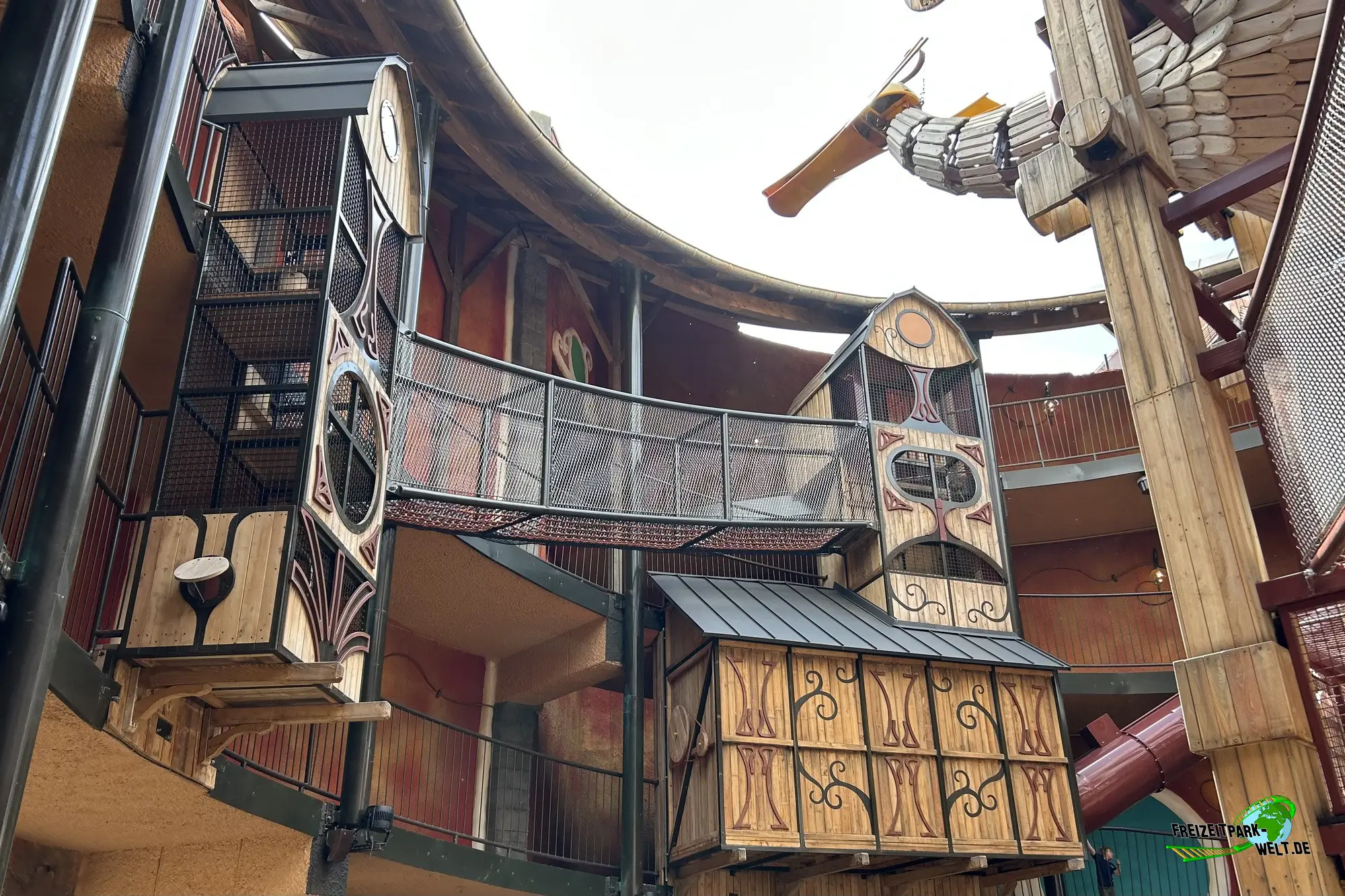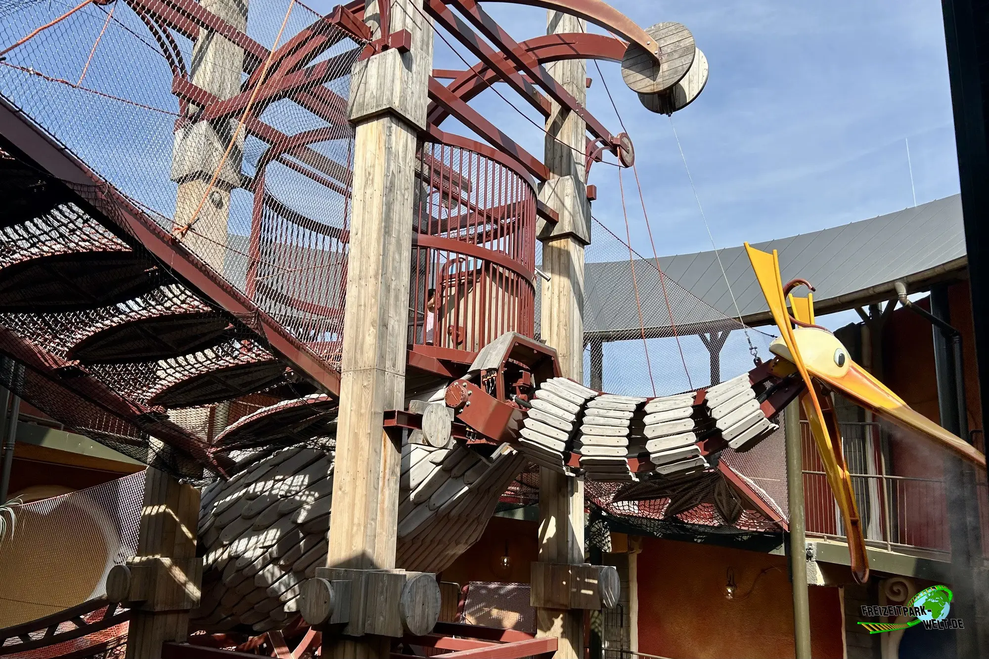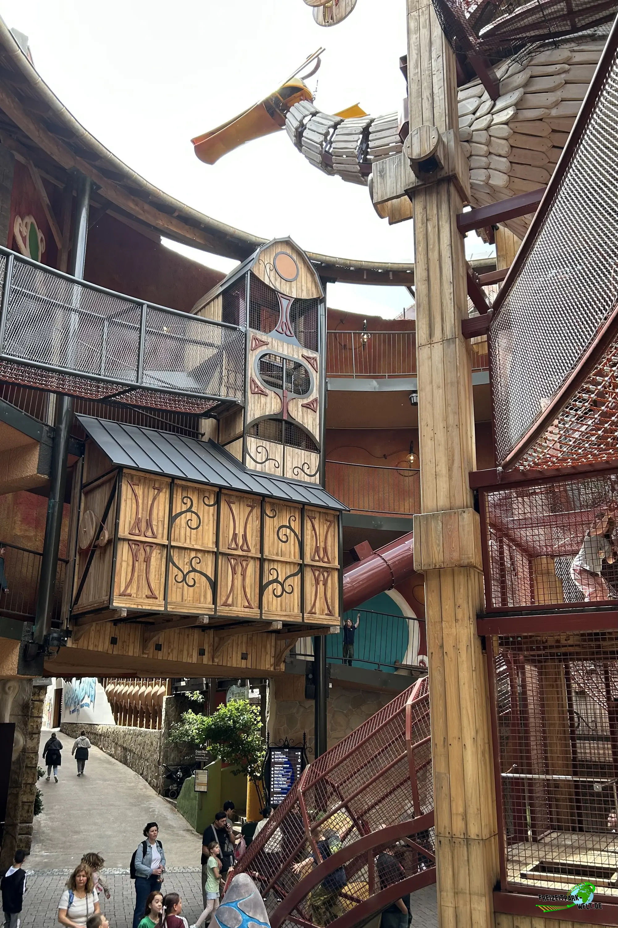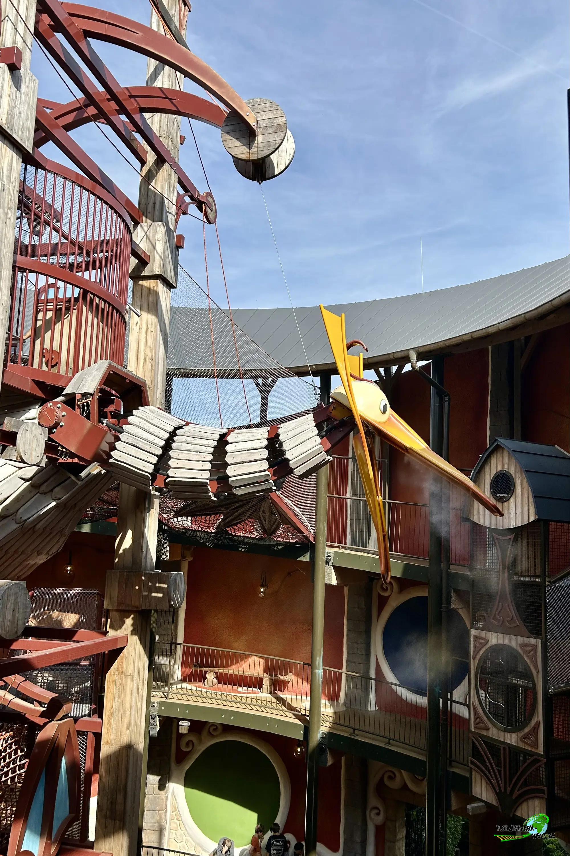 Avoras ist eine tolle Ergänzung für Kinder im Phantasialand, die einfach mal eine Runde klettern möchten. Klettermöglichkeiten gibt es hier nämlich reichlich unter dem Riesenvogel Avoras. Zwischen großen, breiten Kletternetzen, kleinen Leitern und versteckten Pfaden gibt es hier einiges für Kinder jeden Alters zu entdecken. Und direkt unter dem Vogel ist sogar ein kleines, überdachtes Versteck, das man aber erstmal finden muss. AUch Details finden sich hier viele wie kleine Lastenseilzüge, Bepflanzungen und mehr. Natürlich darf auch der Vogel selbst nicht fehlen, der sich hier sogar bewegt und mit fauchendem Atem immer wieder Präsenz zeigt. Und wer auf das Kletterabenteuer doch lieber verzichtet kommt trotzdem in den Genuss der beiden Röhrenrutschen, die mit Lichteffekten ausgestattet sind und sich entlang der großen Rampe befinden. Diese führt übrigens weiterhin direkt in den Wuze Town Kinderbereich.