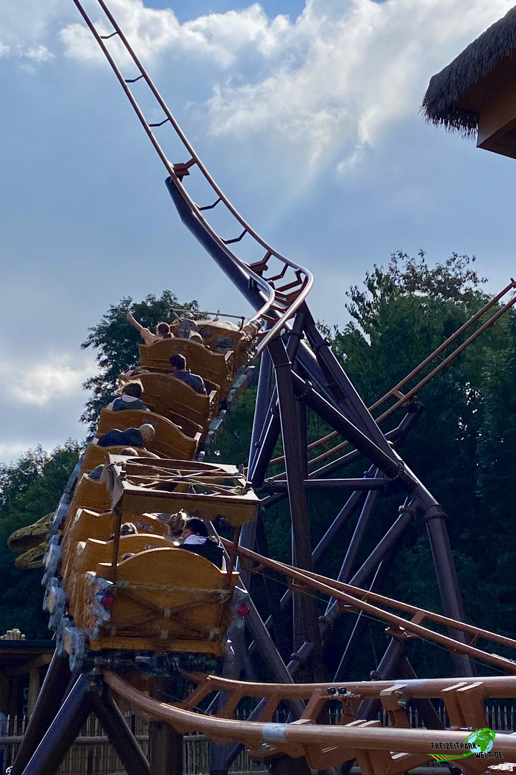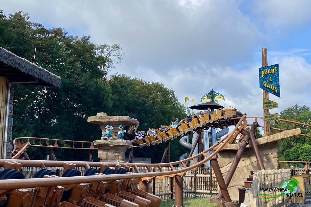 Der in den letzten Jahren entstandene Themenbereich "Wilde Steinzeit" feiert in der Saison 2025 mit der Eröffnung der spektakulären Achterbahn Braus & Saus seinen glanzvollen Schlusspunkt. Die Achterbahn wurde direkt gegenüber der 2023 eröffneten Klippenschleuder platziert und bringt wie diese auch das Steinzeit-Feeling richtig gut rüber. Zusammen mit Themenpark Designer Alex Korting hat man hier wieder eine schöne kleine Story entwickelt, denn Braus & Saus ist nicht nur eine Achterbahn im Steinzeit-Look. Vielmehr handelt es sich hierbei um eine Waschanlage bzw. das was man in der Steinzeit als Waschanlage bezeichnen könnten. Schon der Look der Achterbahnwagen ist was besonderes. Selten bringen Achterbahnwagen das Thema so gut rüber wie hier und fast könnte man meinen man steigt in einer der Wagen der Familie Feuerstein ein.