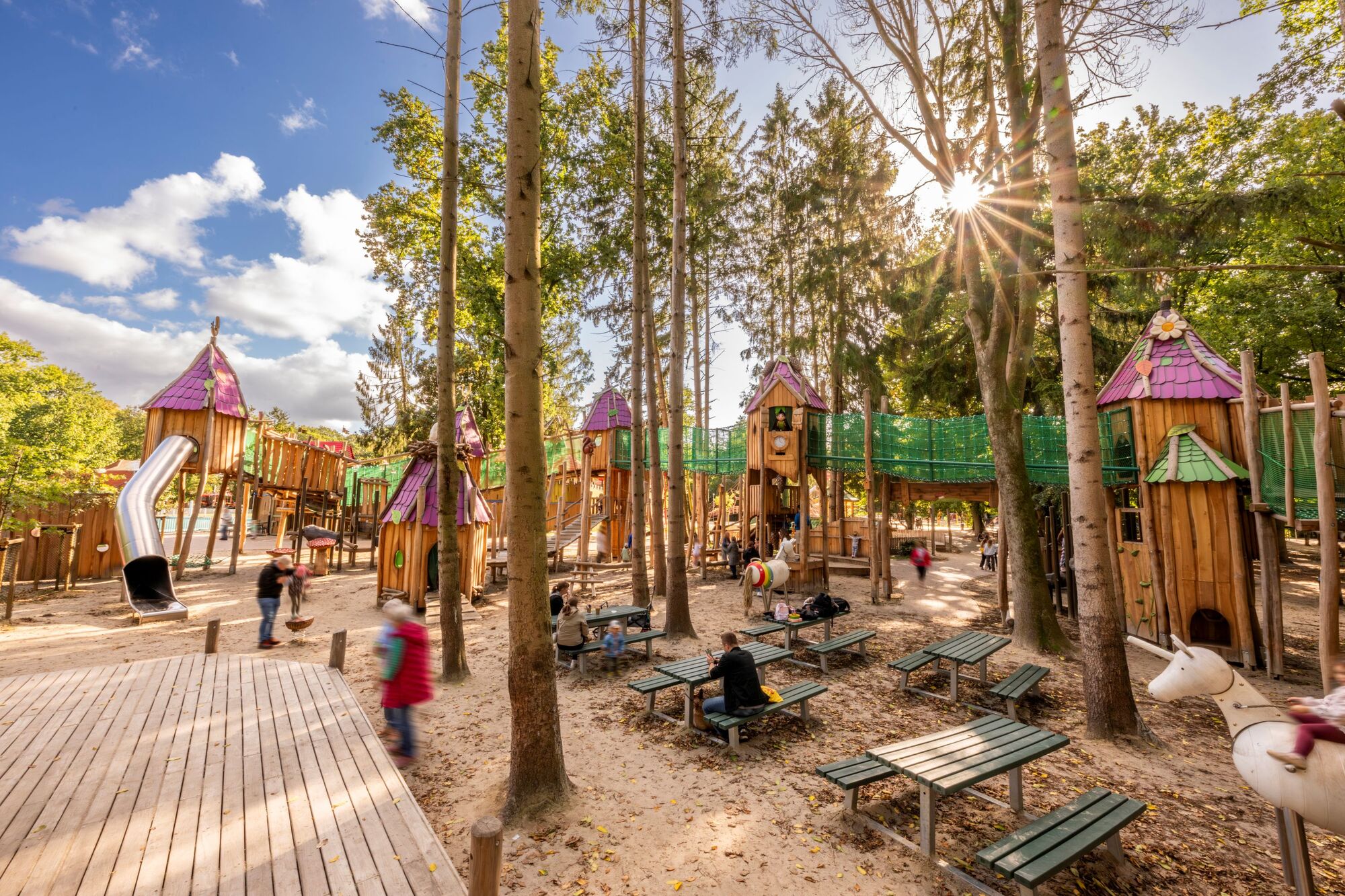 Schattige Plätze fanden die Besucher auch im neuen Feenwald „Der hat unsere Besucher wirklich verzaubert”, freut sich der Parkbetreiber: Märchenhafte Kletterelemente, magische Türme und verwunschene Baumhäuser entführen kleine und große Entdecker in eine fantasievolle Welt „Für die Gestaltung hatten wir uns Zeit gelassen in der letzten Winterpause und bis zum Schluss an vielen Details gefeilt”, so Freiherr von Landsberg-Velen, „aber das hat sich gelohnt.”