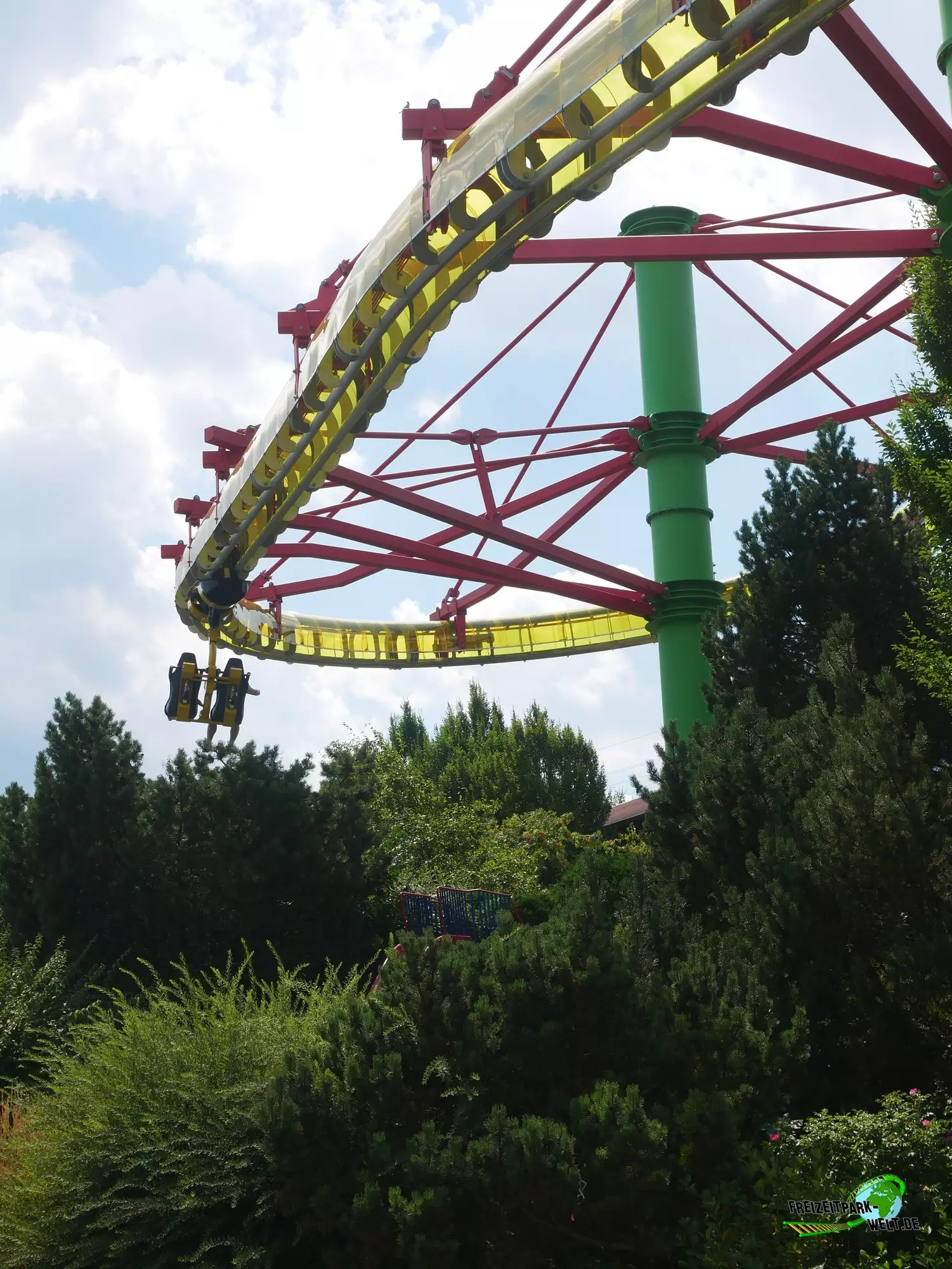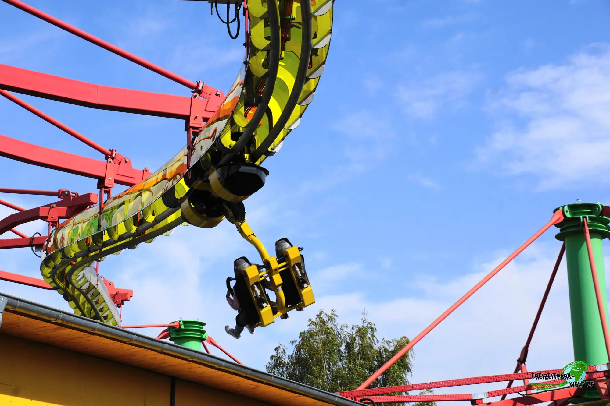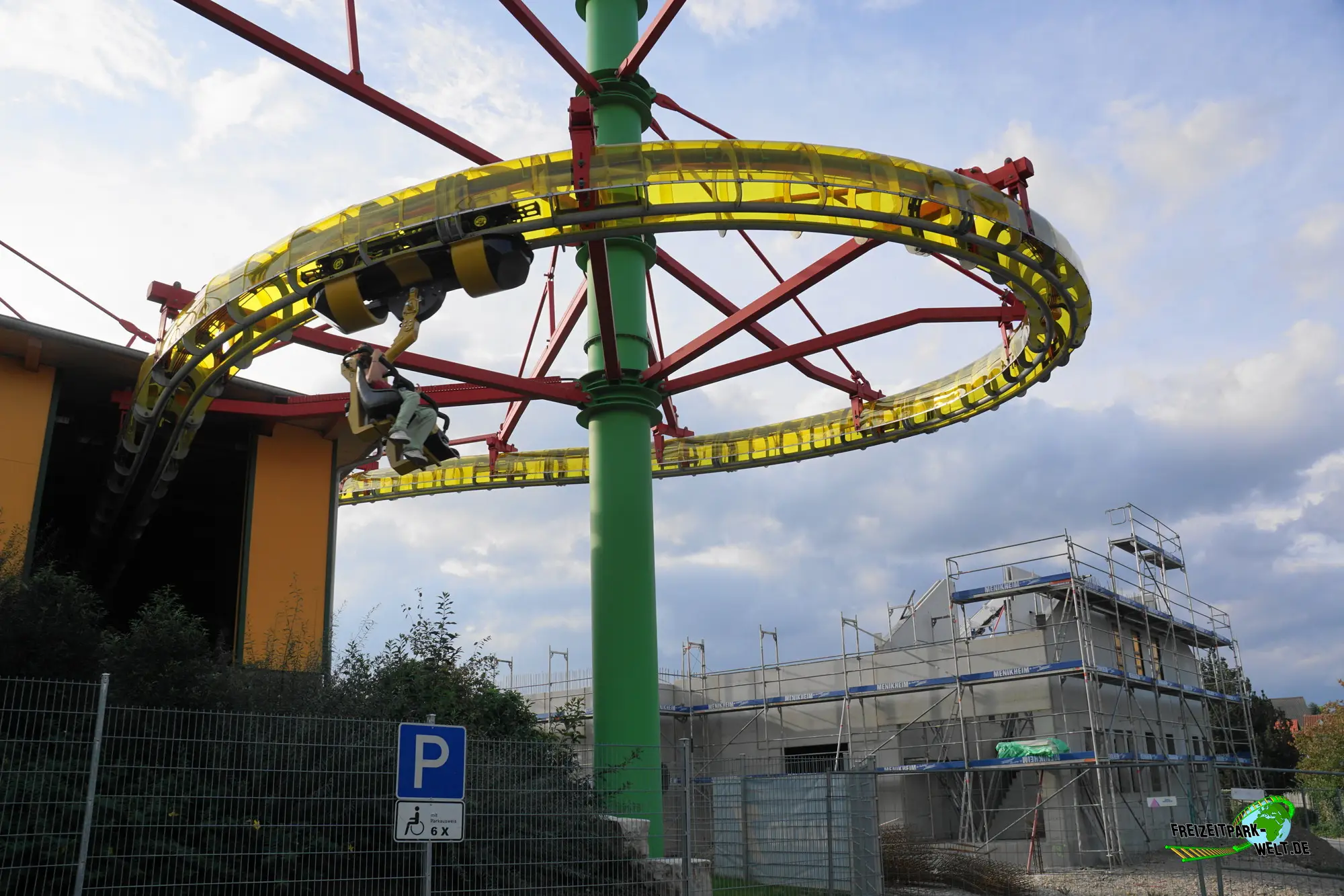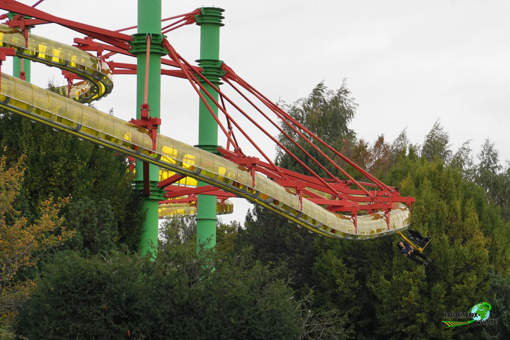 Die Fahrt verläuft dabei über fast 500m komplett durch den oberen Teil des Parks aber immer über den Köpfen der Besucher hinweg. Zunächst geht es aufwärts einmal rund um die Station von Hummel Brummel. Dann fliegt man über den Parkeingang hinweg bis zu den Koi-Teichen und kann die tolle Aussicht so richtig genießen. Die lange Gerade zieht sich bis zur Traktorfahrt, wo es mit einer Rechtskurve langsam wieder in den oberen Teil geht. Hier ist vor allem die schöne Botanik hervorzuheben, die hier sogar einige Near-Miss Effekte entstehen lässt. Besonders viel Spaß macht es in den Zwei-Personen-Gondeln wenn man mit viel Schwung in die Kurven gehen kann und dann zur Seite ausschwingt.Thematisch ist Hummel Brummel, wie der Name schon erahnen lässt, an die Hummeln angelehnt. Hierzu gibt es im Bereich der Station auch einige Facts, ansonsten hält sich die Thematisierung aber in Grenzen. Technisch handelt es sich um einen Wie-Flyer des Herstellers Wiegand, wobei die Anlage im Schwaben Park die größte ausgelieferte Anlage dieses Typs ist. Wegen der recht geringen Kapazität kann es an Feiertagen auch mal zu längeren Wartezeiten kommen. Kinder können in Begleitung bereits ab 1,05m über den Baumwipfeln fliegen. Ohne Eltern muss man 1,40m sein.