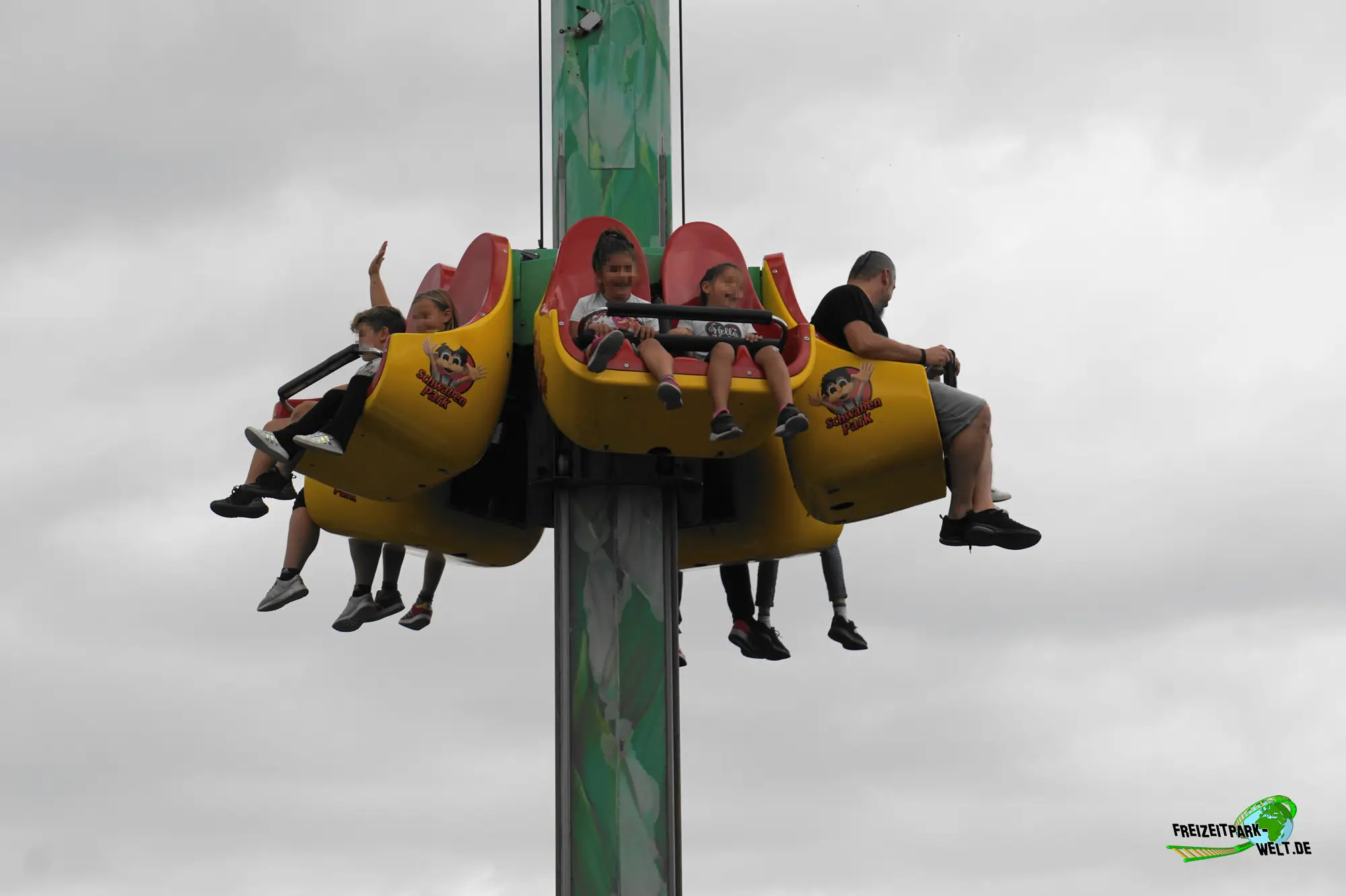 Die "Verrückte Palme" ist einer der ersten Family Tower von Zierer gewesen und konnte direkt bei den Besuchern mit karibischer Palmenoptik punkten. Das größte Plus dieser neuen Generation von Mini Freifalltürmen ist aber die Rotation der Gondel, als auch der äußerst interessante Fahrablauf mit vielen Auf- und Abfahrten.
