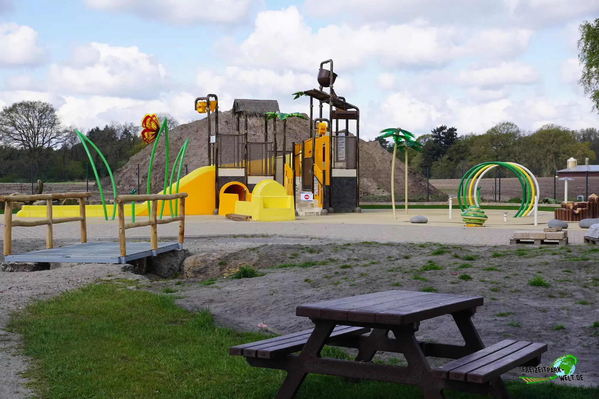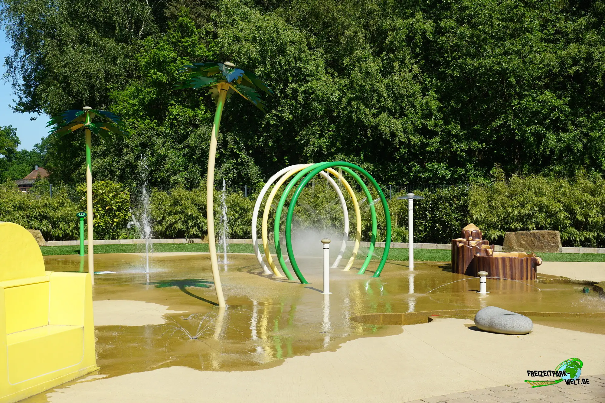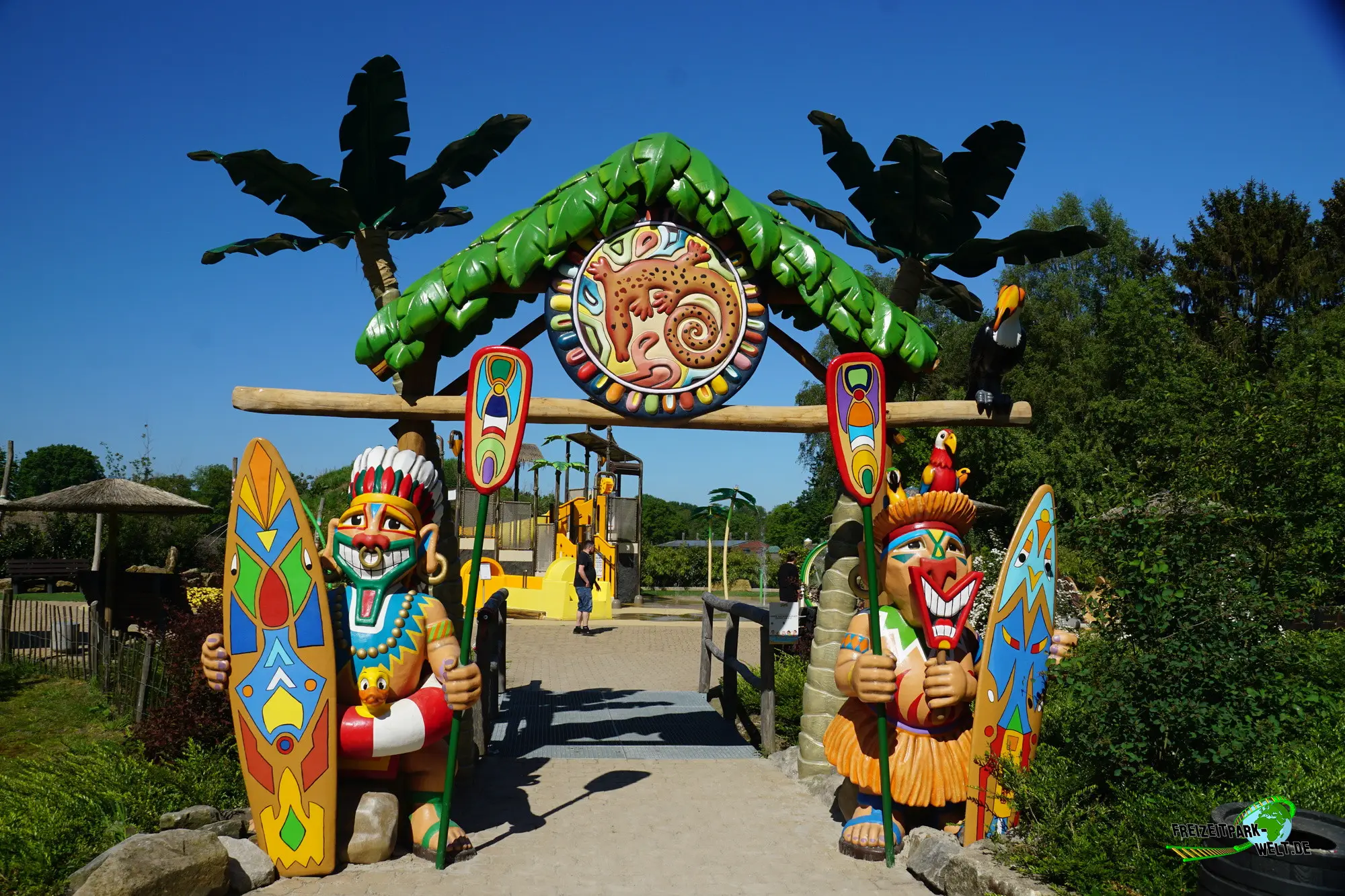 Zwar nicht regelrecht reinspringen aber die Möglichkeit ordentlich nass zu werden und gutes Sommerwetter mit den Kindern zu genießen gibt es hier definitiv. Die Anlage besteht aus einer Rutschenkombi mit einer kurzen Röhrenrutsche und einer etwas kleineren offenen Rutsche. Zusätzlich gibt es einen größeren Spray-Park mit Spraytunnel und einigen schön gestalteten Spritz-geräten. Auch eine kleine Umkleide ist vorhanden.Insgesamt ein schöner Bereich der sich gut in die Tiki-Thematik einbettet.