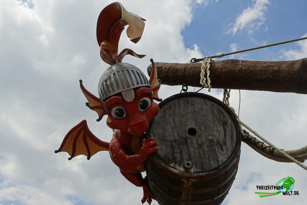 Ganz am Ende des Sees gibt es mit "The Flaming Feather" ein Bedienrestaurant zu entdecken. Die Gestaltung als Pferdestall zieht sich bis zu den Toiletten durch und ist äußerst gelungen. Auch das Innere wartet mit echtem Kamin, einem Sternenhimmel und vielen kleinen Details auf, wobei die keltische Grundthematik auch hier eher rustikal ist. Gleich daneben gibt es für Kinder einen kleinen Spielplatz von merry go round aus Teltow, so dass auch hier nur wenig Langeweile beim Warten auf das Essen aufkommen sollte. Und das Warten hat bei unserem Besuch auch leider etwas zu lang gedauert, wobei sich hier die Prozesse natürlich erst einspielen müssen.