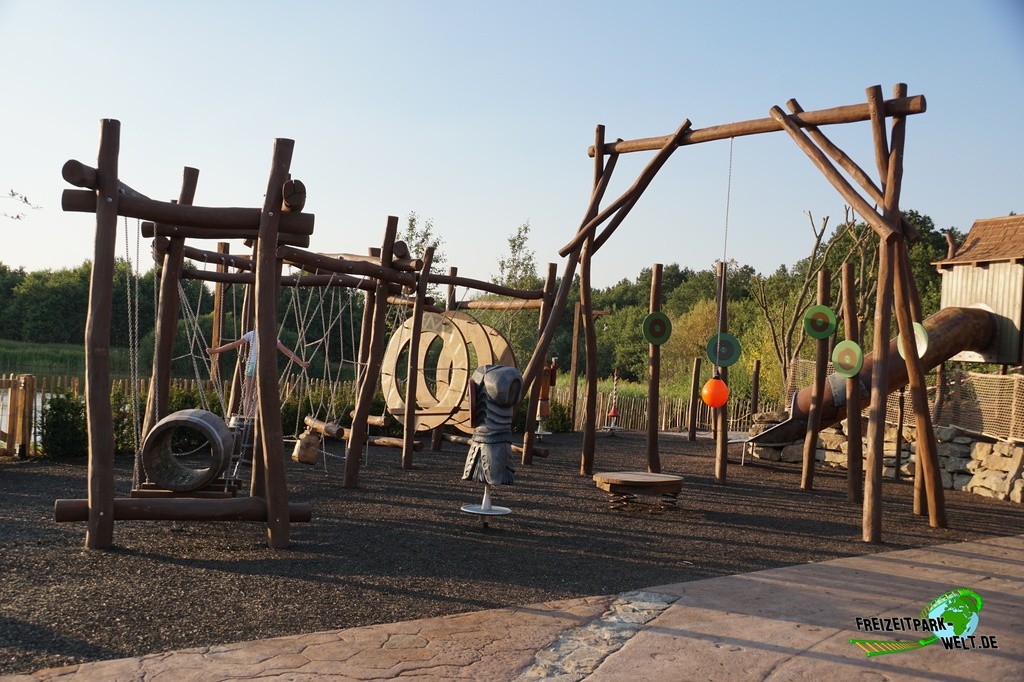 Ganz am Ende des Sees gibt es mit "The Flaming Feather" ein Bedienrestaurant zu entdecken. Die Gestaltung als Pferdestall zieht sich bis zu den Toiletten durch und ist äußerst gelungen. Auch das Innere wartet mit echtem Kamin, einem Sternenhimmel und vielen kleinen Details auf, wobei die keltische Grundthematik auch hier eher rustikal ist. Gleich daneben gibt es für Kinder einen kleinen Spielplatz von merry go round aus Teltow, so dass auch hier nur wenig Langeweile beim Warten auf das Essen aufkommen sollte. Und das Warten hat bei unserem Besuch auch leider etwas zu lang gedauert, wobei sich hier die Prozesse natürlich erst einspielen müssen.