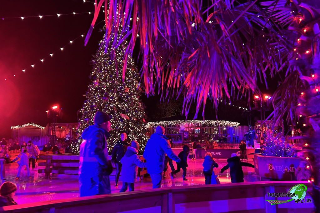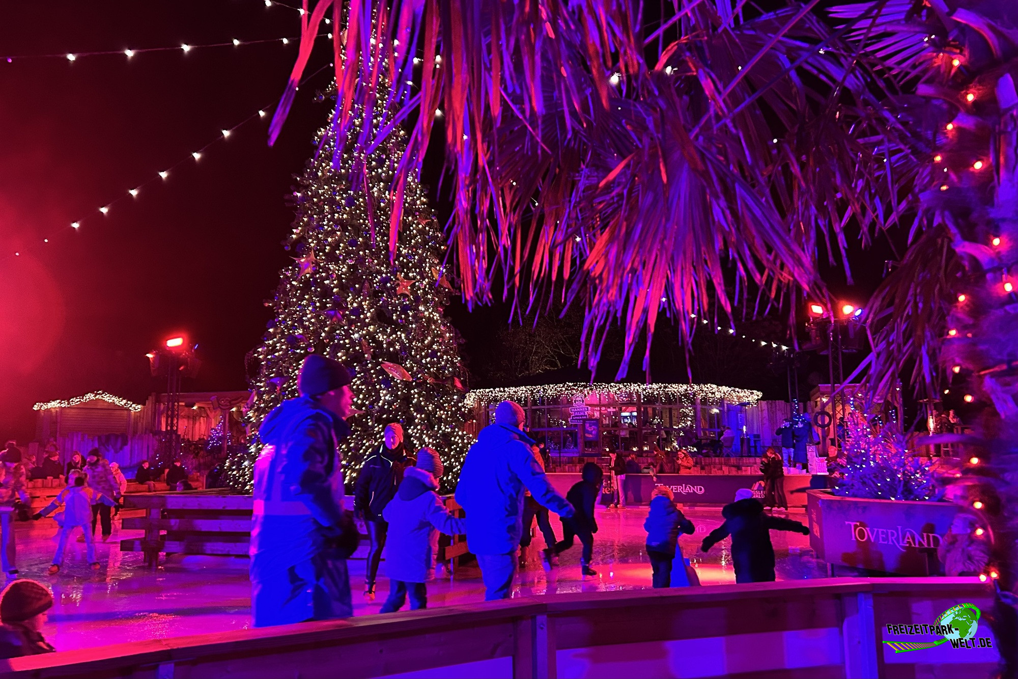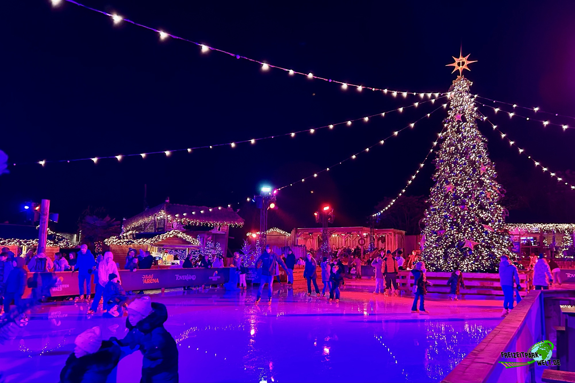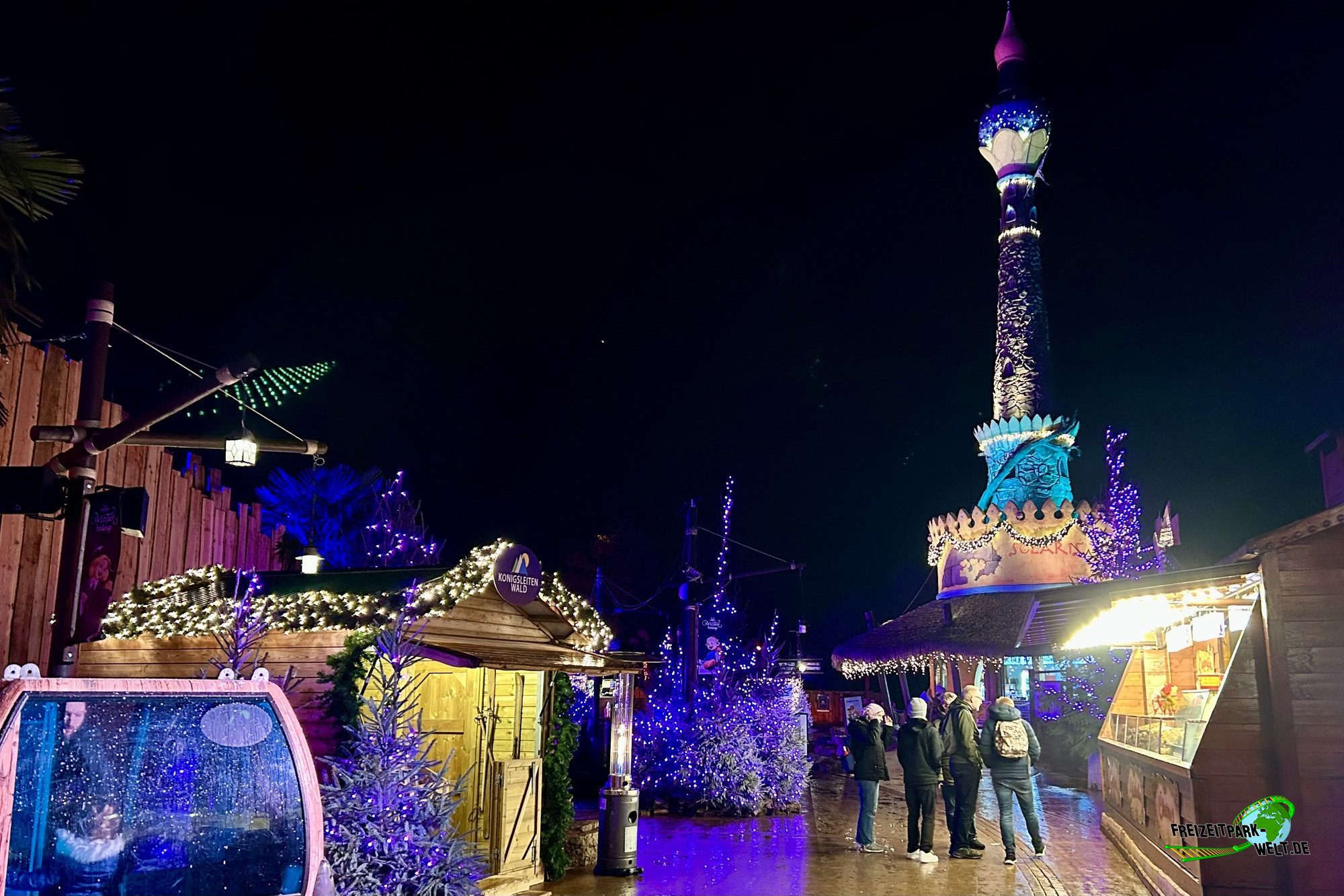 Das eigentliche Winterhighlight ist das Winterdorf im Themenbereich Port Laguna. Hier am Eingang wird Weihnachten in einem Dorf mit den klassischen Winter-Aktivitäten zelebriert und ein Weihnachtsbaum in der Mitte gehört natürlich auch dazu. Daneben wartet eine Eislaufbahn (5 EUR Aufpreis), eine Rodelbahn (kostenlos) und mehrere Curlingbahnen (kostenlos bzw mit Pfand) auf Besucher. Und wer bei den sportlichen Aktivitäten eher passt, kann ganz gemütlich von der oberhalb gelegenen Aprés Ski-Hütte namens Hannesalm das Treiben auf dem Eis beobachten. Bei Tag ist das alles schon ganz schön, aber am Abend kommt mit der funkelnden Beleuchtung richtig schöne Weihnachtsstimmung in diesem Bereich auf. Und zum krönenden Abschluss wartet dann eine Show rund um den Weihnachtsbaum auf die Besucher, die wir aber leider verpasst haben aufgrund des Regens. Im Gegensatz zum Movie Park Germany oder dem Phantasialand konzentriert man sich hier aber auf eine Tanzdarbietung und keine Effekt-Show.