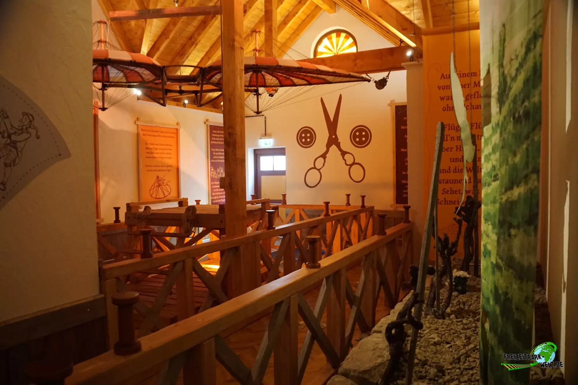 Besonders ist beim Höhenflug aber auch die Warteschlange in der die Abenteuer des Albrecht Ludwig Berblinger erzählt werden. Dabei wird sogar von Fun House Elementen Gebrauch gemacht. Zudem wurde der Wartebereich Tripsdrill-typisch mit viel Liebe dekoriert und auch die Toiletten nebenan sind im gleichen Design umgesetzt.Eine weitere Besonderheit sind auch die Fontänen unterhalb des Sky Fly, die während der Fahrt fast bis an die Beine der Fluggäste spritzen und damit noch mehr Aufregung während der Fahrt bieten.