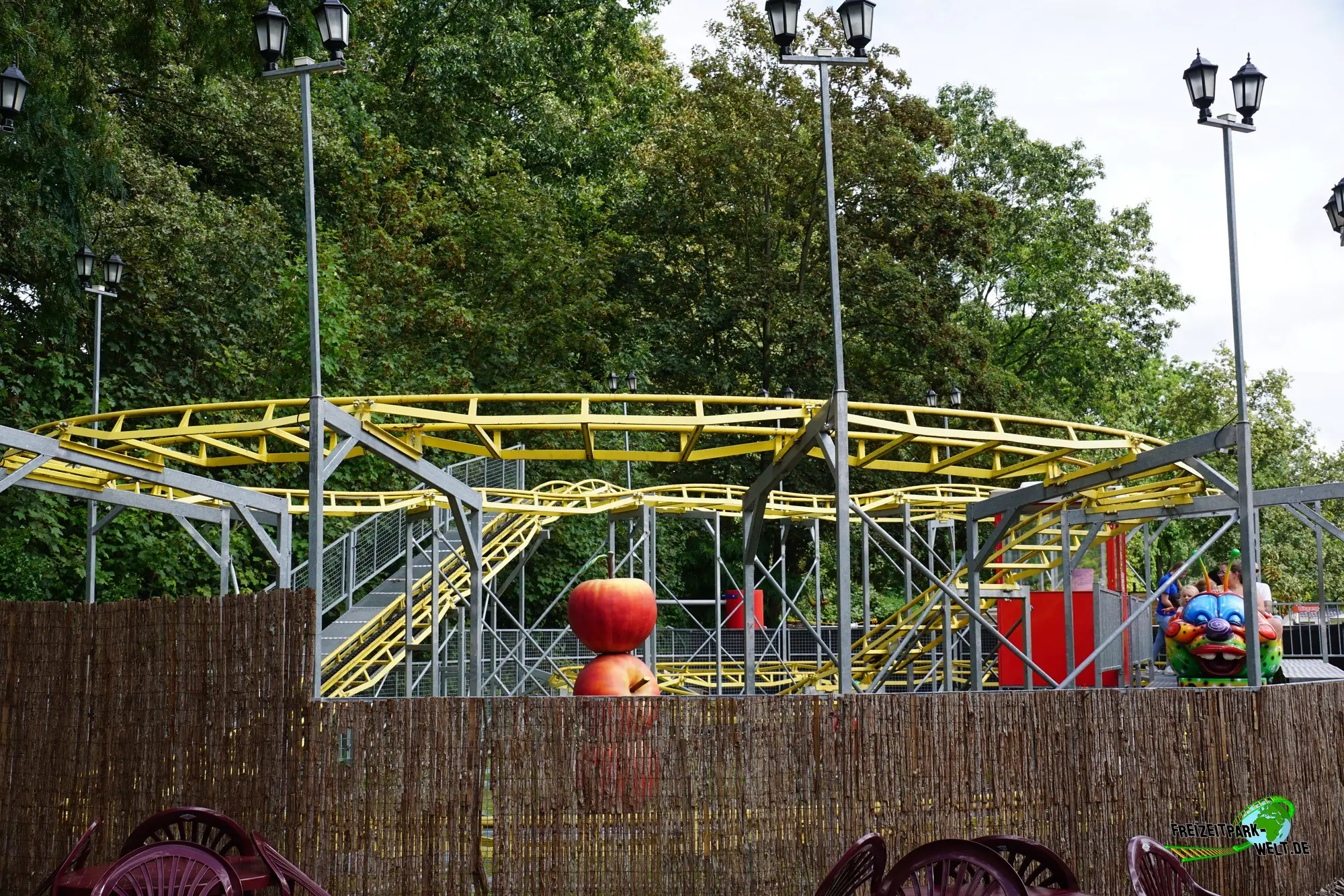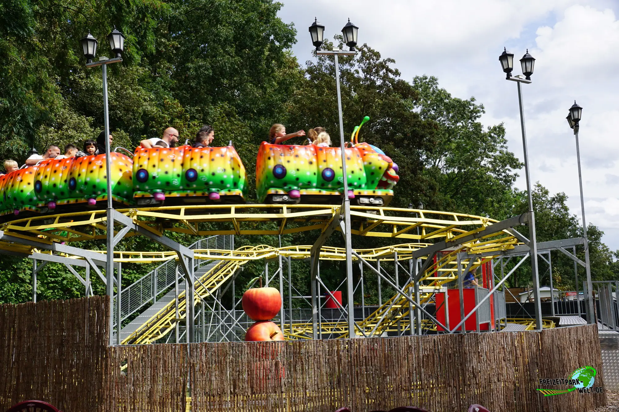 Der kleine gelbe Wurm Rupsje Mae befindet sich in einer der Ecken des Freizeitparks De Waarbeek zwischen dem Snack-Bereich und dem Freefall. Das Layout der Achterbahn ist sehr kinderfreundlich, denn man fährt den rückseitigen Lift hoch und macht dann oben erstmal eine kleine Aussichtsrunde mit ein paar Wellen. Erst nach einer weiteren Kurve, die sehr langsam durchfahren wird, ist es Zeit für den First (und Last) Drop. Mit viel Schwung rauscht der Wurm in die nächste Kurve und landet dann bereits wieder in der Station.