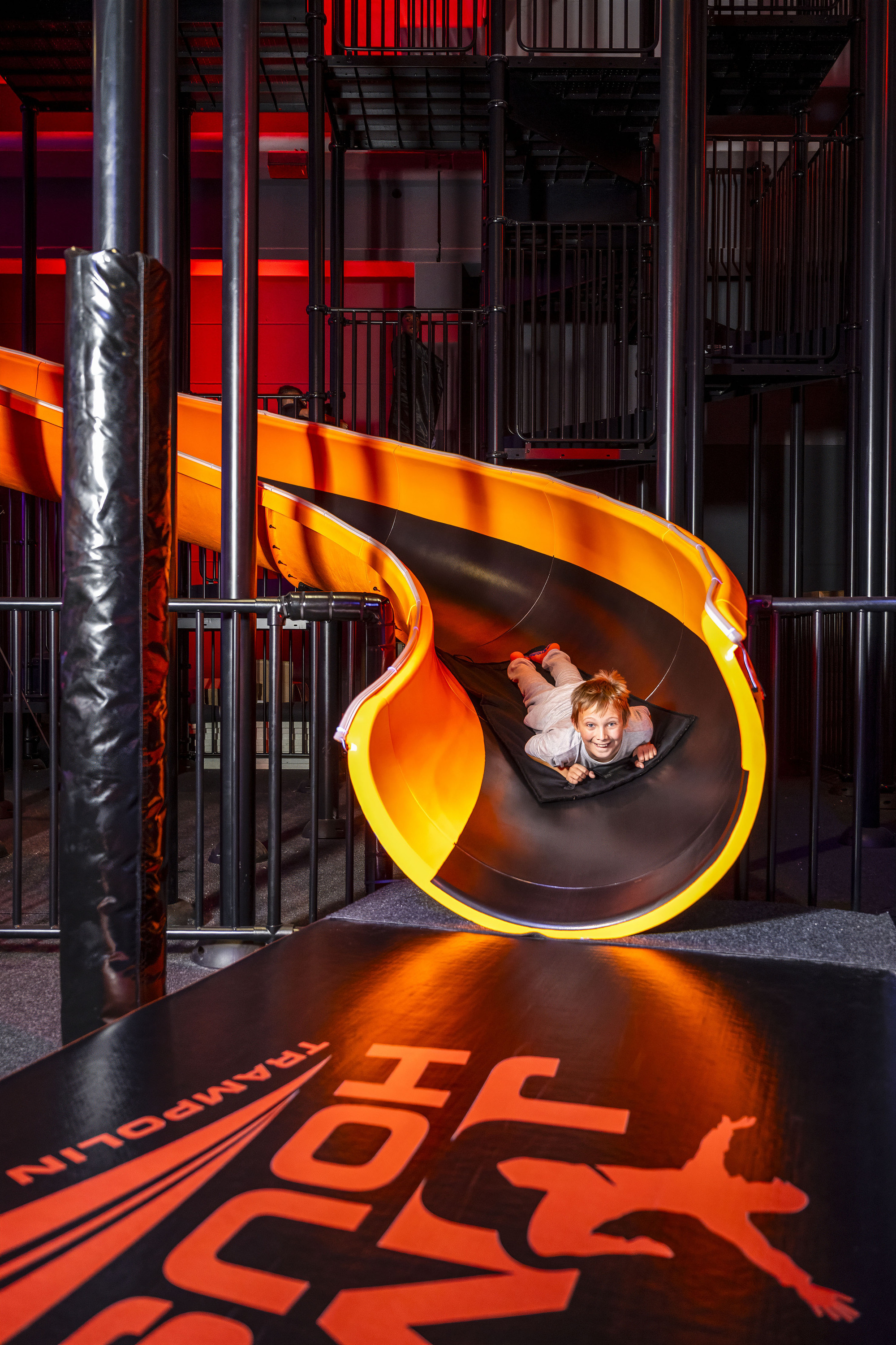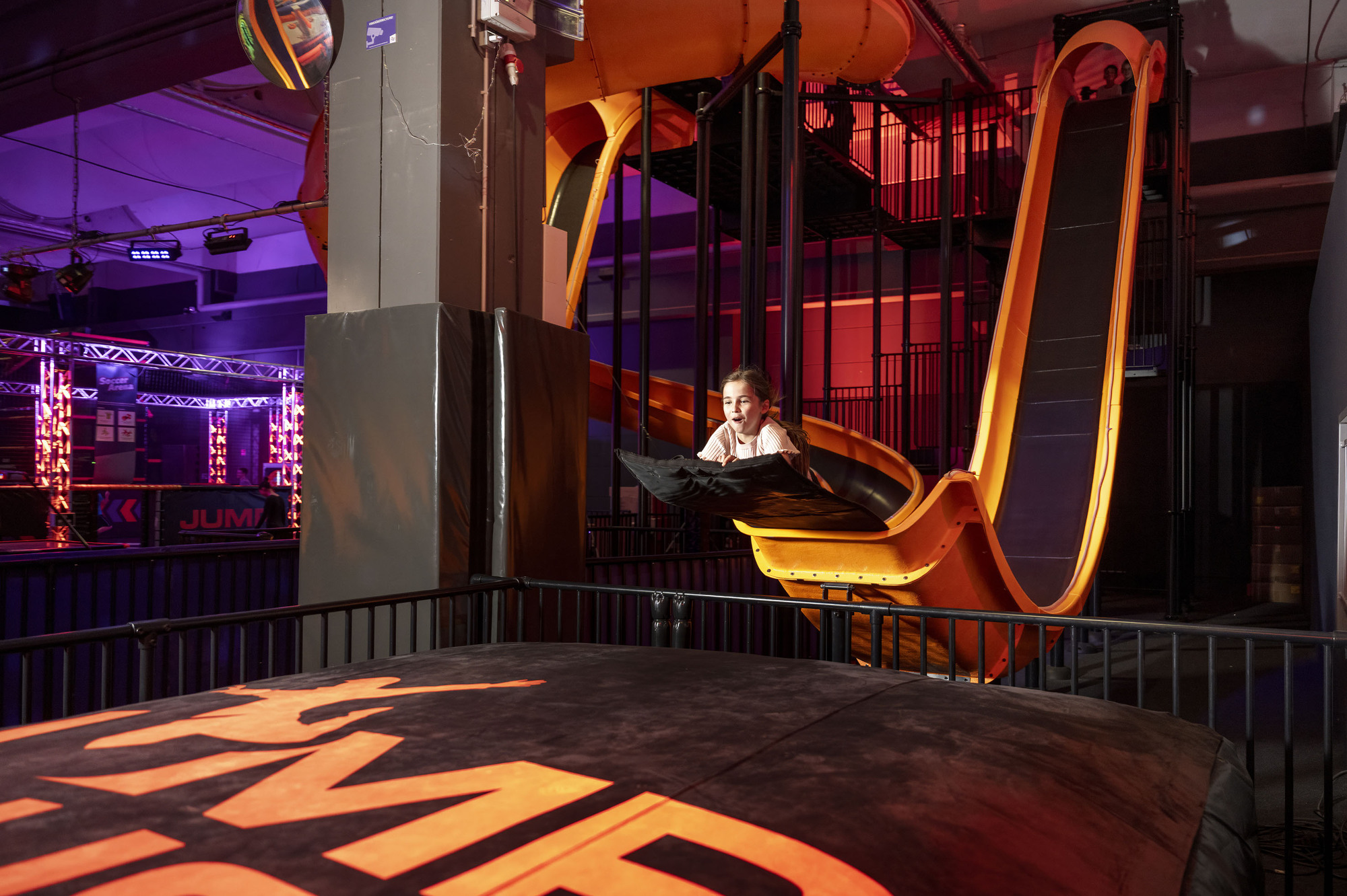 Eines der neuen Highlights im JUMP House Köln sind die so genannten Action Slides, die in Deutschland nur die JUMP House Gruppe bietet: Bei einer actionreichen Rutschpartie geht es auf einer Matte Kopf voraus aus knapp sieben Metern Höhe in die Tiefe. Gleich drei verschiedene Riesenrutschen warten im neugestalteten JUMP House Köln: Mal geht’s durch eine Spirale, mal in die Halfpipe und mal hoch hinaus beim Sprung von der Rutsche.