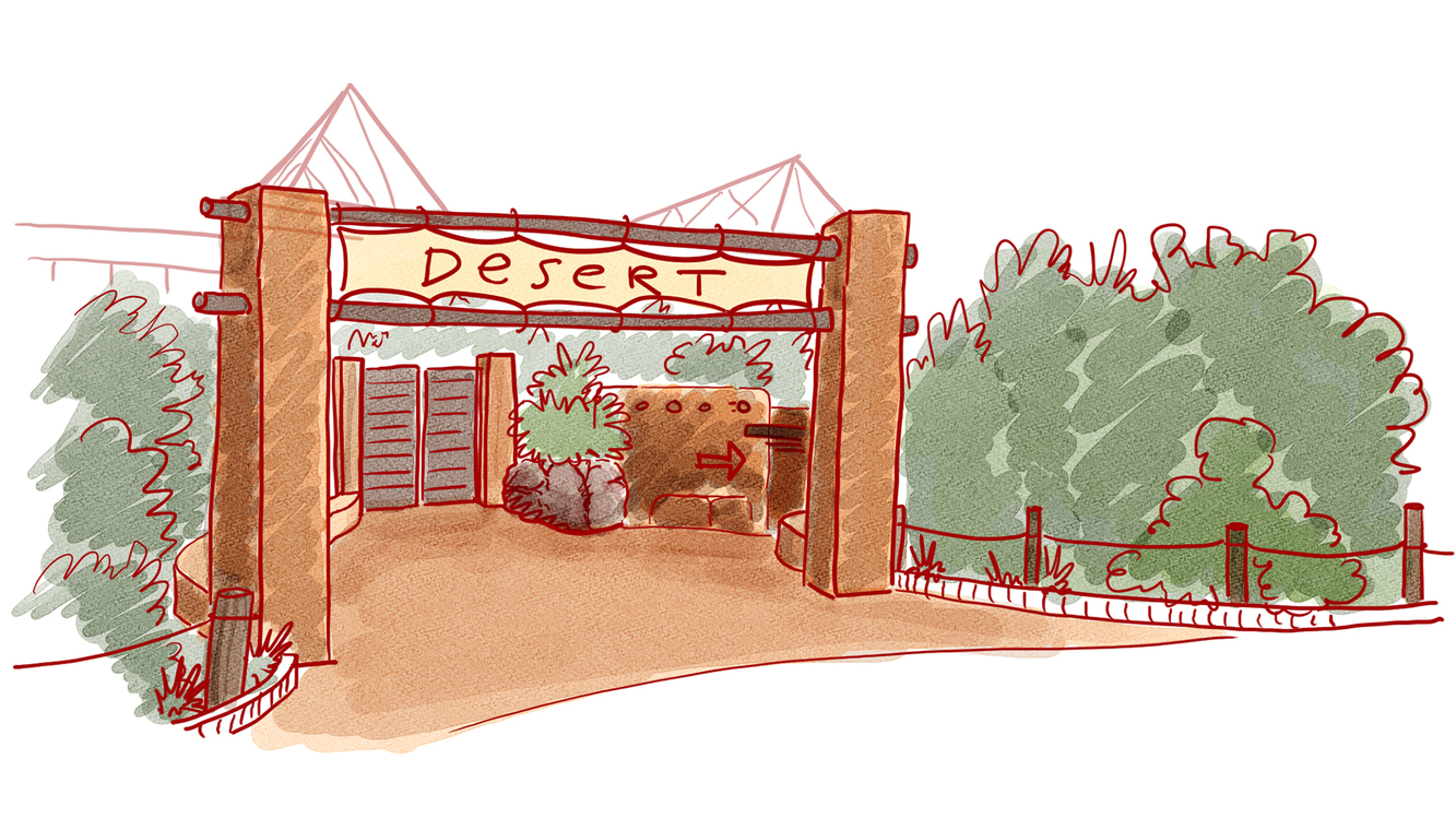 In Umfragen, die der Burgers’ Zoo unter seinen Besuchern durchgeführt hat, wird das Ökodisplay Desert häufig als „schwer zu finden“ und „schwer zugänglich“ bewertet Derzeit entdecken Besucher das Desert über einen unterirdischen Tunnel, der vom Ökodisplay Bush ins Desert führt Der Ausgang der amerikanischen Felswüste befindet sich zurzeit auf Höhe des Tigergeheges im Zoobereich Rimba Der Zoo legt nun einen neuen Ein- und Ausgang direkt neben dem Elefantengehege an: Dadurch wird das Desert leichter zu finden und bequemer zu besuchen sein