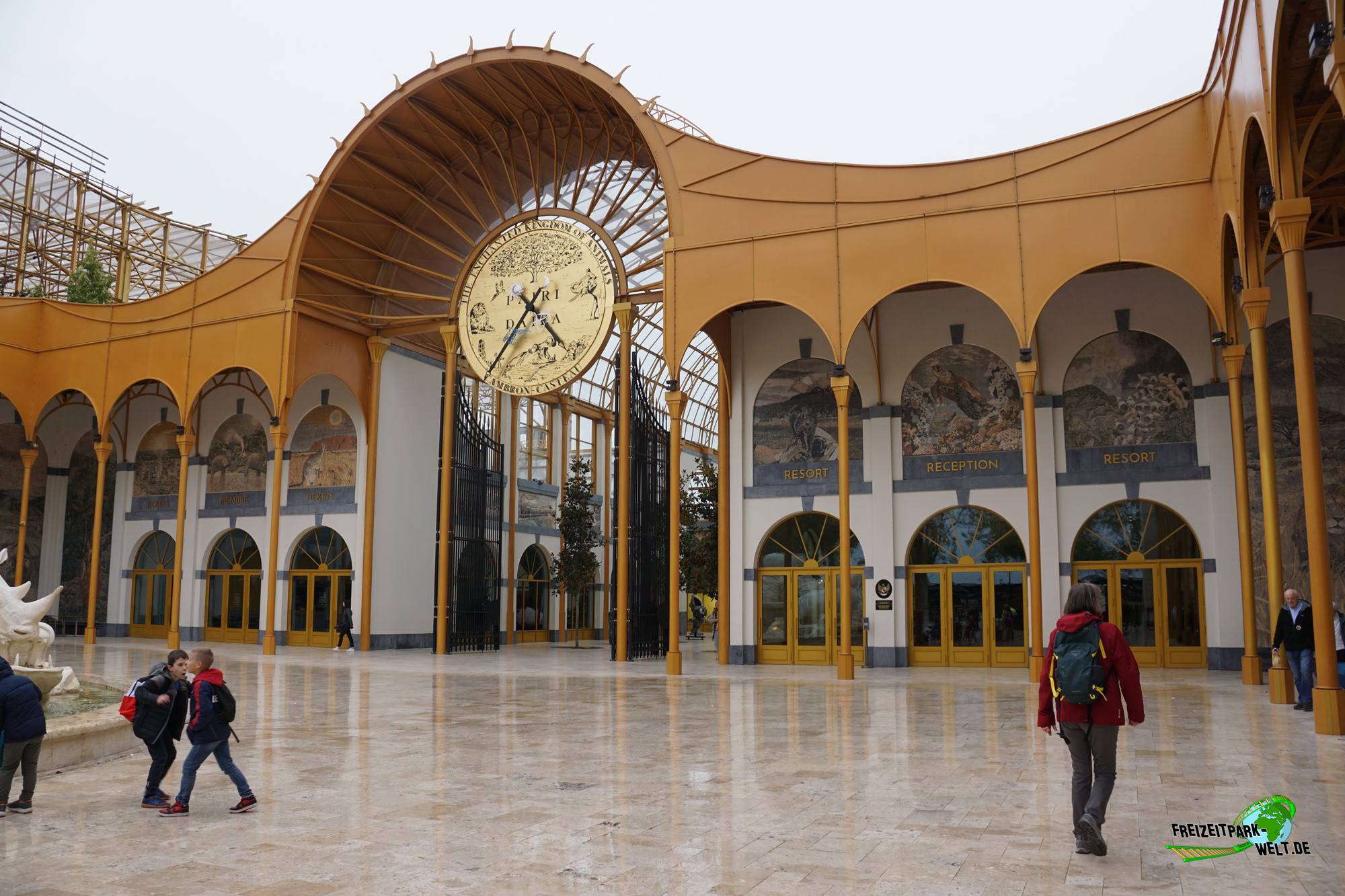 Schon der Eingang fällt mit seiner Main Street und dem Welcome Brunnen pompös aus. In der überdachten Fußgängerzone Richtung Zoo-Eingang befinden sich verschiedene Shops, die Kassen sowie die Hotel-Rezeption. Am Ende geht es dann durch das Drehkreuz und man betritt einen großen Hub, von dem es in drei der neun Themenbereiche abzweigt. Direkt geradeaus sieht man ein großes Aquarium hinter einer alten Häuserfassade in dessen Fenstern überall Displays mit synchronisiertem Fisch-Panorama sind. Ein toller Anblick, der in den Themenbereich Cambron-sur-Mer führt.