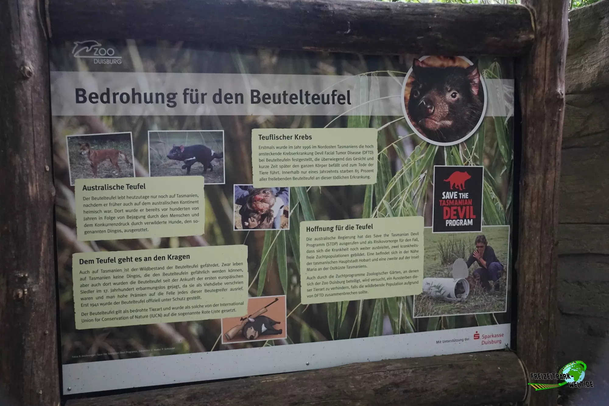 Aus diesem Grund gibt es in den Zoo weltweit Erhaltungsprogramme, die den Beutelteufel erhalten sollen. Auch im Zoo Duisburg wurde eine große Anlage zwischen den Steppenzebras und den Robben eröffnet. Dabei sind die kleinen Raubbeutler sehr gut durch die vielen Glasscheiben zu beobachten. Zudem gibt es in Deutschland bisher nur wenige Zoos in denen Beutelteufel ein Zuhause haben.