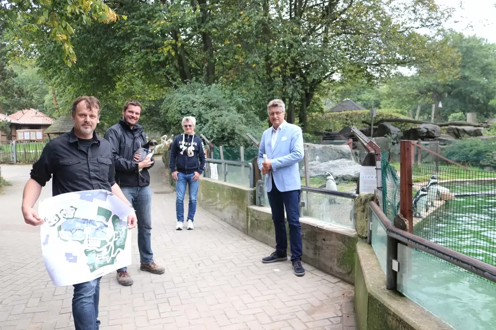 Bis Mitte 2022 erhalten hier Seelöwen, Seehunde, Pinguine und Pelikane für 8 Millionen Euro ein neues Zuhause mit mehr Platz (v.l.n.r.: Thorsten Vaupel, technischer Leiter, Andreas Wulftange, zoologische Leitung, Zoogeschäftsführer Andreas Busemann, Zoopräsident Dr. E.h. Fritz Brickwedde).