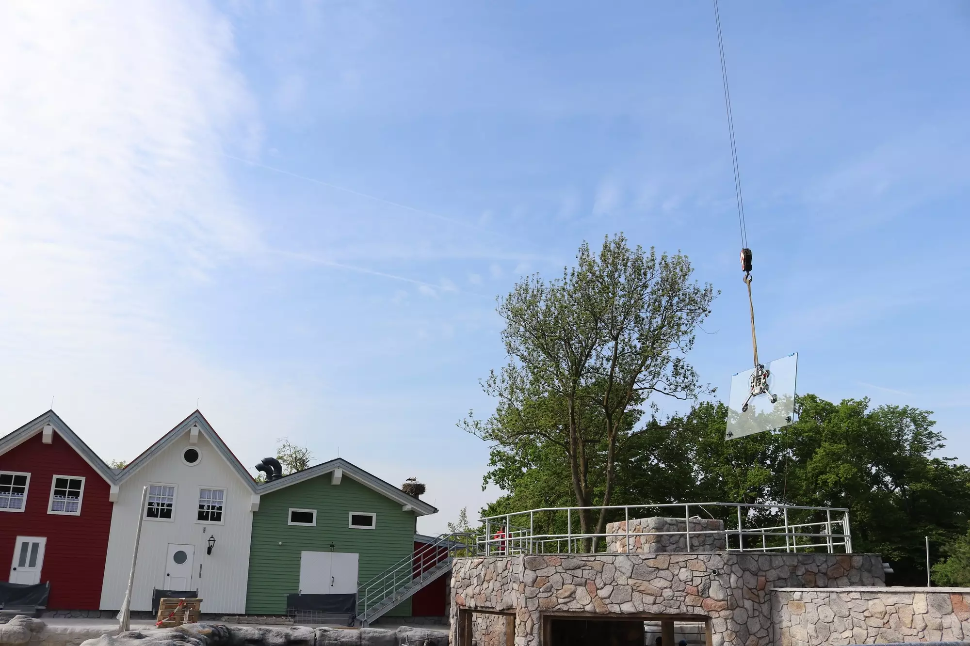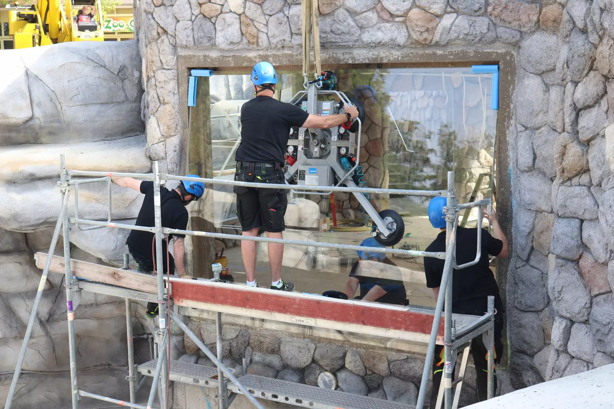 Vorsichtig, damit ja nichts schiefgeht, setzen die Handwerker die riesige Panoramascheibe aus Sicherheitsglas in den Unterwasser-Panoramaraum der neuen „Wasserwelten“ im Zoo Osnabrück ein.