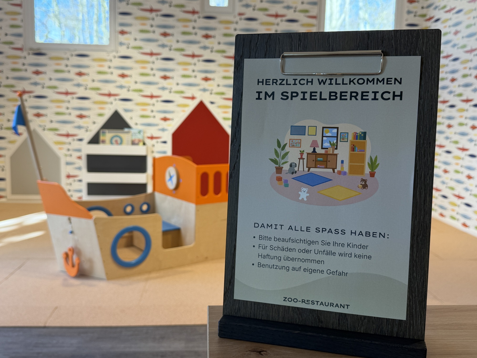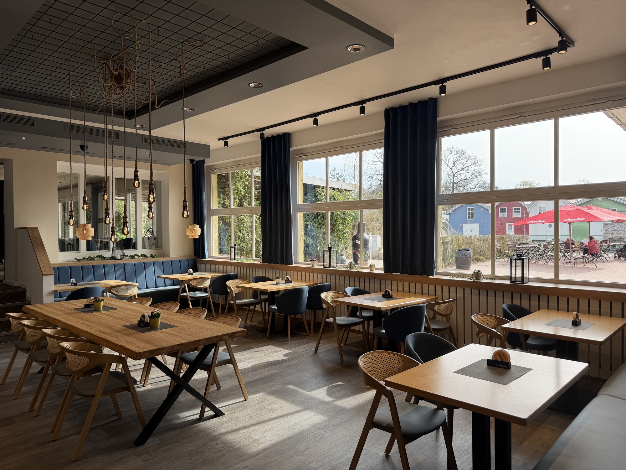 Für die Neugestaltung war es wichtig, Gemütlichkeit mit einem Bezug zu den Wasserwelten Mariasiel zu verbinden. „Als Teil der Wasserwelten haben wir uns von der Nordsee und den nordischen Ländern inspirieren lassen. Unser Restaurant vermittelt Gemütlichkeit und Wohlbefinden. Gleichzeitig haben wir mit verschiedenen Blautönen und Holzarten für maritimes Flair gesorgt“, erläutert Zoo-Architekt Robert Buss. Neben dem neuen Erscheinungsbild wurden auch die Sanitäranlagen erneuert und um ein behindertengerechtes WC ergänzt.